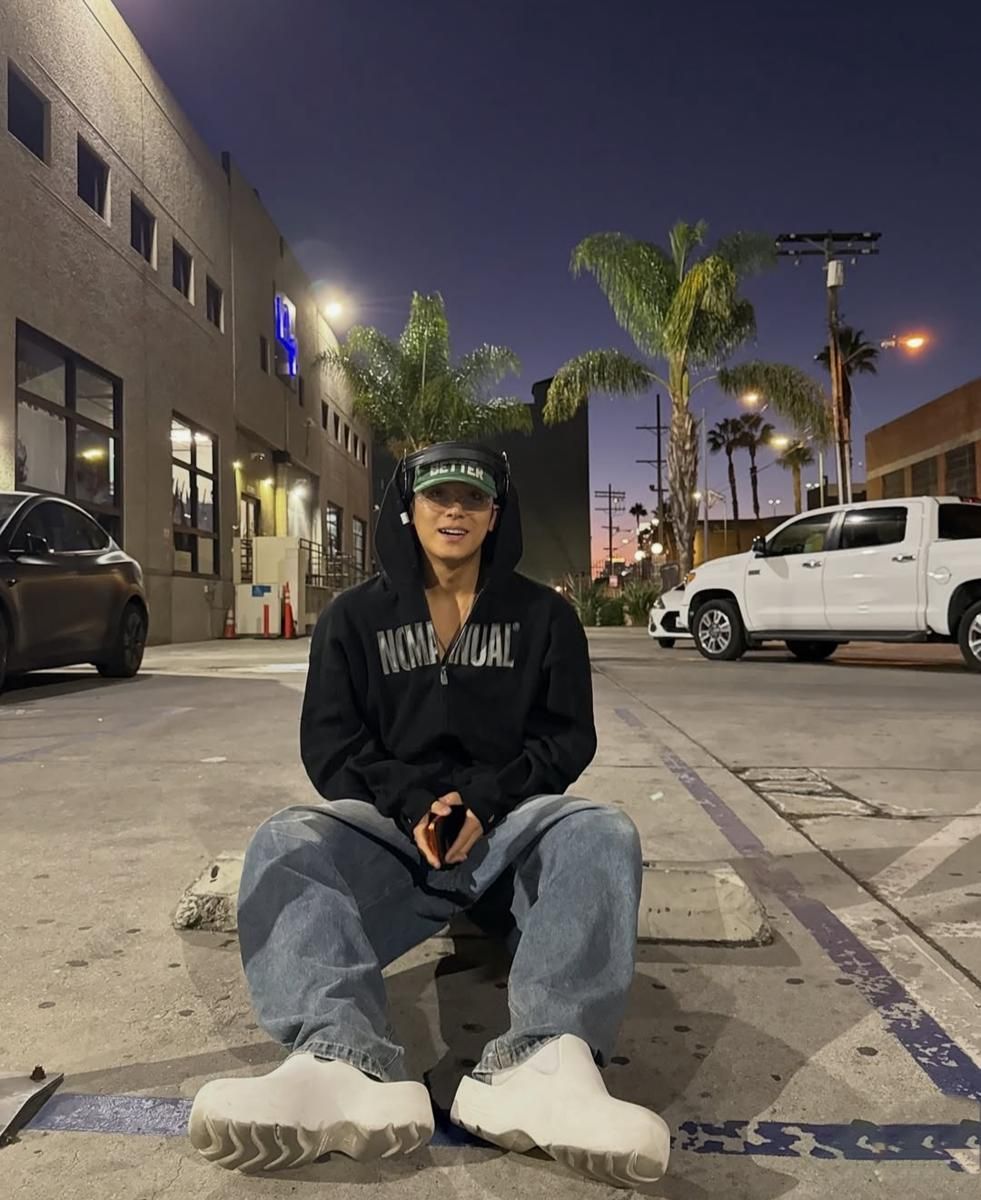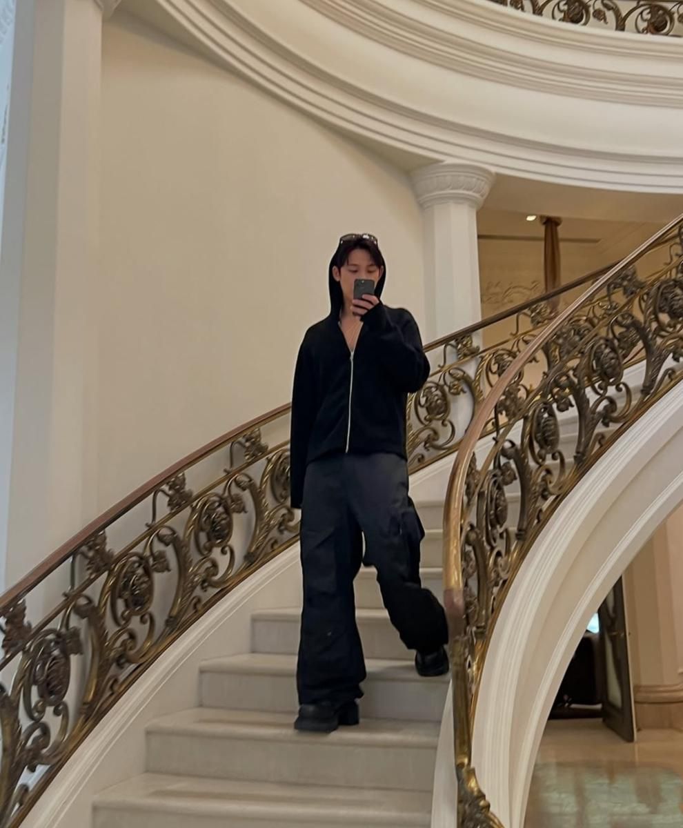 Dengan hoodie dan cargo pants, Mingyu tampil edgy dengan gaya yang simpel namun penuh aura misterius.
