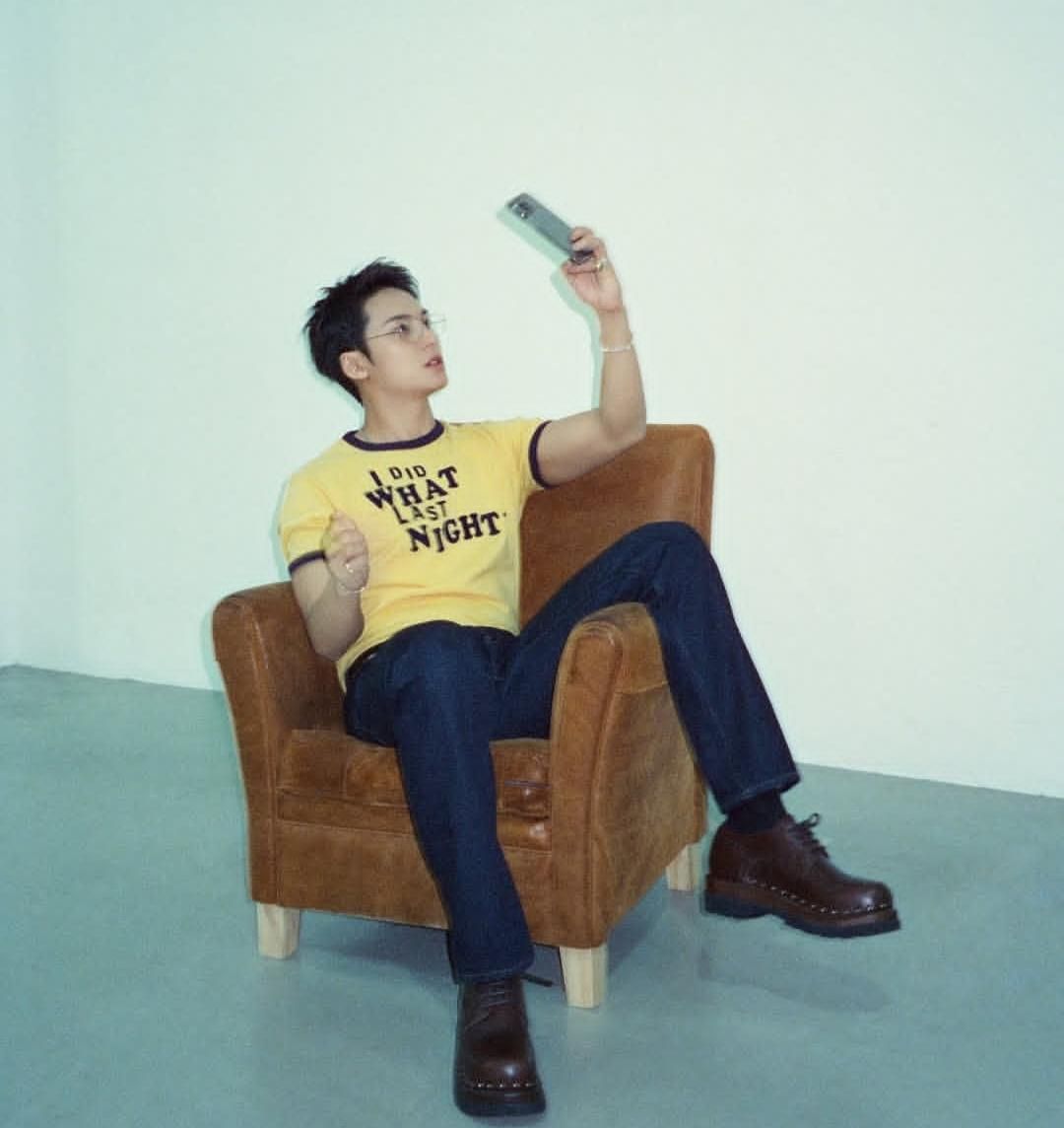 Dengan kaus kuning, jeans gelap, dan sepatu chunky vintage, Mingyu berhasil tampil keren dengan gaya retro yang sedang naik daun.