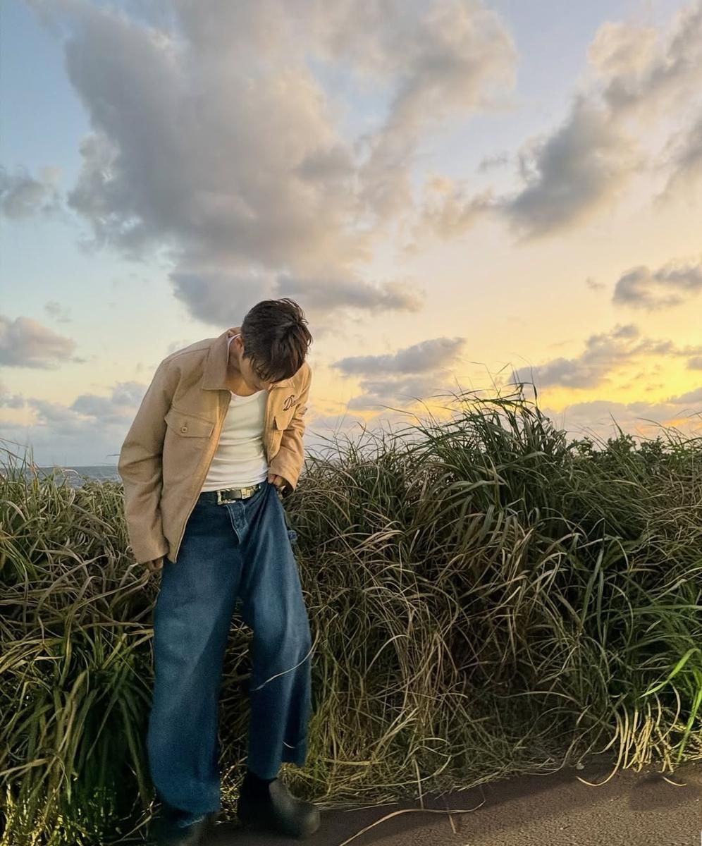 Menggunakan jaket beige, tank top putih, dan jeans longgar, penampilan ini cocok untuk suasana sunset. Kesannya hangat dan estetik akan memperkuat penampilanmu.