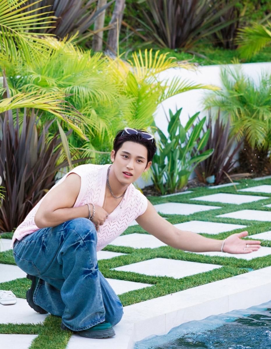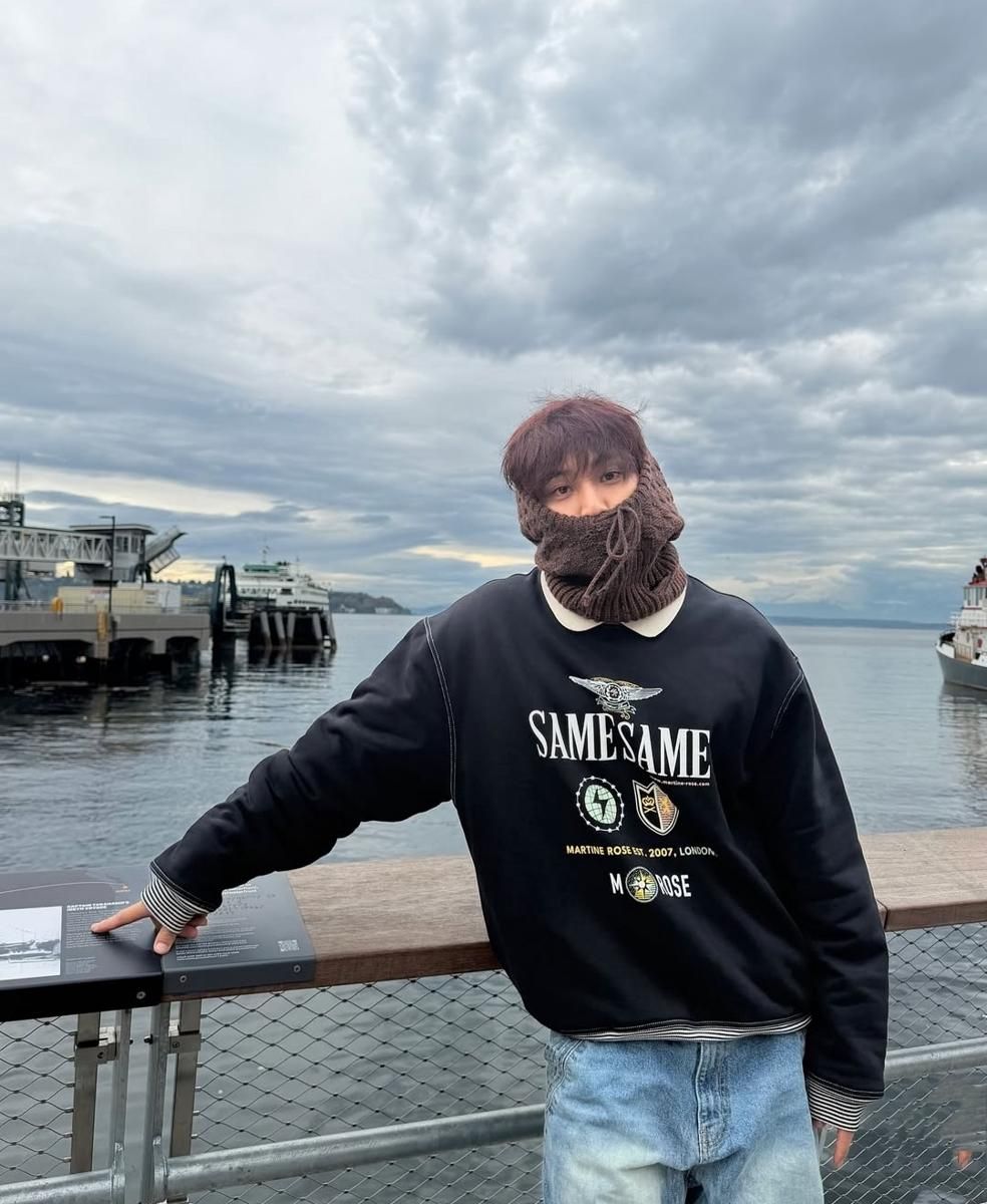 Mingyu tampil dengan sweater pink yang manis, dipadukan dengan jeans longgar. Penambahan aksesoris membuat penampilannya semakin maskulin dan menarik.Kaus navy dan jeans longgar dengan jaket denim